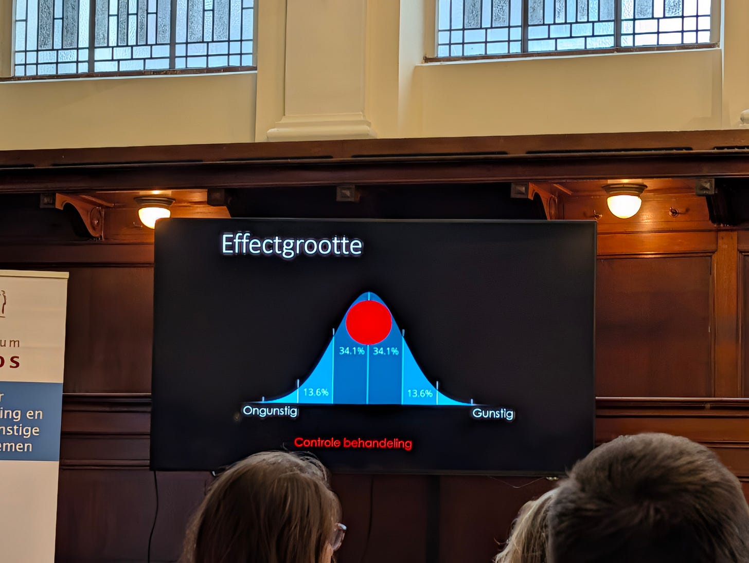 De volgende spreker licht de resultaten van Lars toe vanuit het concept ‘effectgrootte. Een effectgrootte geeft aan hoe groot het verschil is tussen twee metingen, uitgedrukt in standaarddeviaties. Lars vond in zijn onderzoek vaak grote effectgroottes van 1.0 of zelfs richting de 2.0 tussen de begin- en eindmeting, wat een behoorlijk verschil aangeeft.