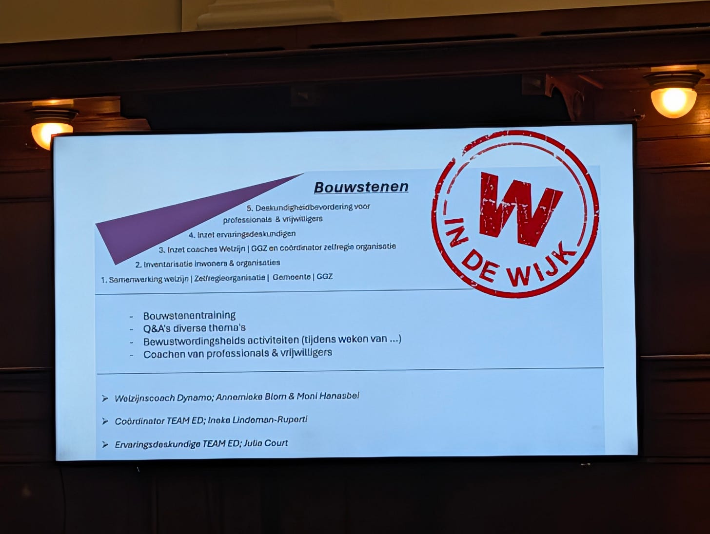 Julia en Annemiek presenteren het project “We in de Wijk”, een initiatief in Amsterdam gericht op het bouwen aan inclusieve wijken. De aanpak is gebaseerd op een samenwerking tussen welzijn, zelfregieorganisaties, de gemeente en de GGZ. Het doel is om vrijwilligers en professionals in de wijk te ondersteunen om beter om te gaan met situaties van onbegrip en uitsluiting. Dit doen ze door coaching, training en het organiseren van evenementen over thema’s als verslaving, armoede en eenzaamheid. De samenwerking zorgt voor korte lijntjes en een omgeving waar gewone gesprekken kunnen ontstaan, wat bijdraagt aan eigen regie en herstel in het dagelijks leven.